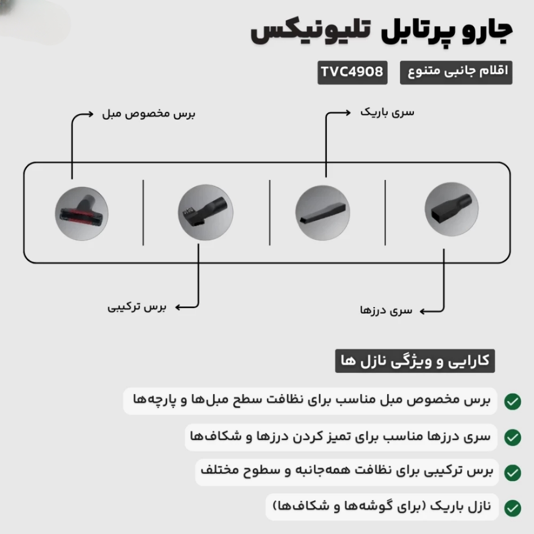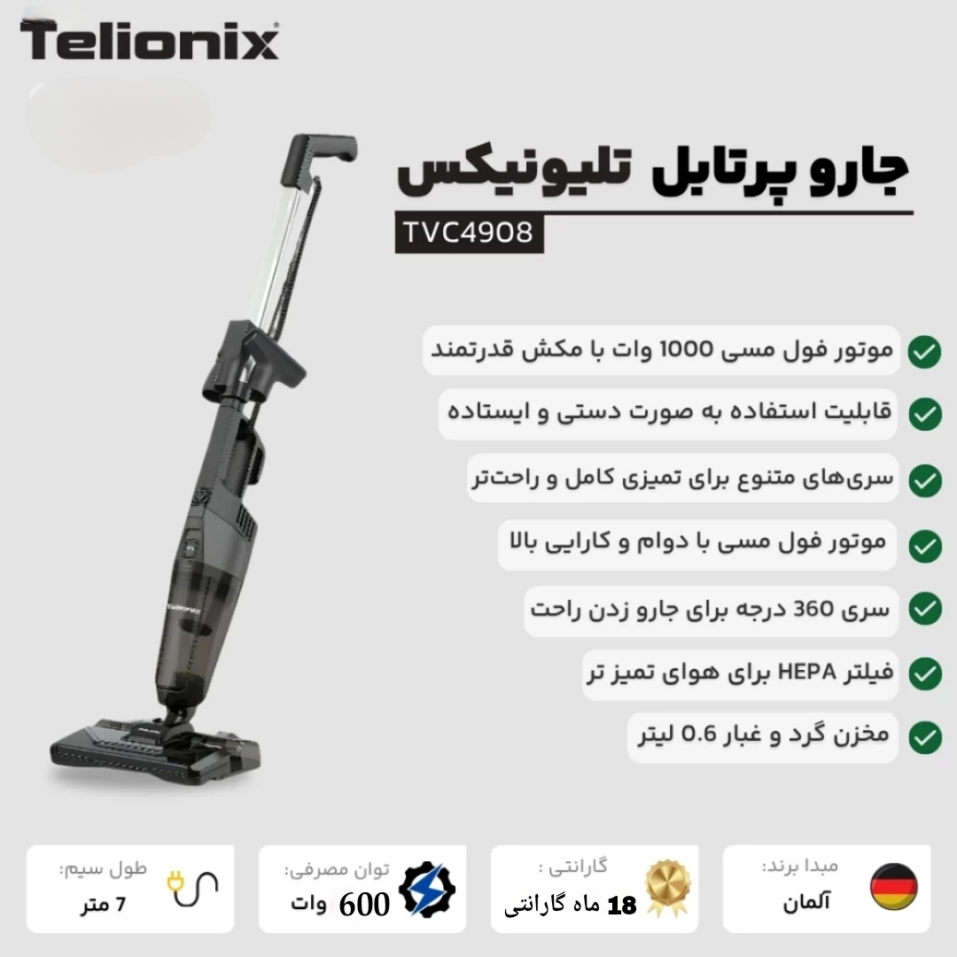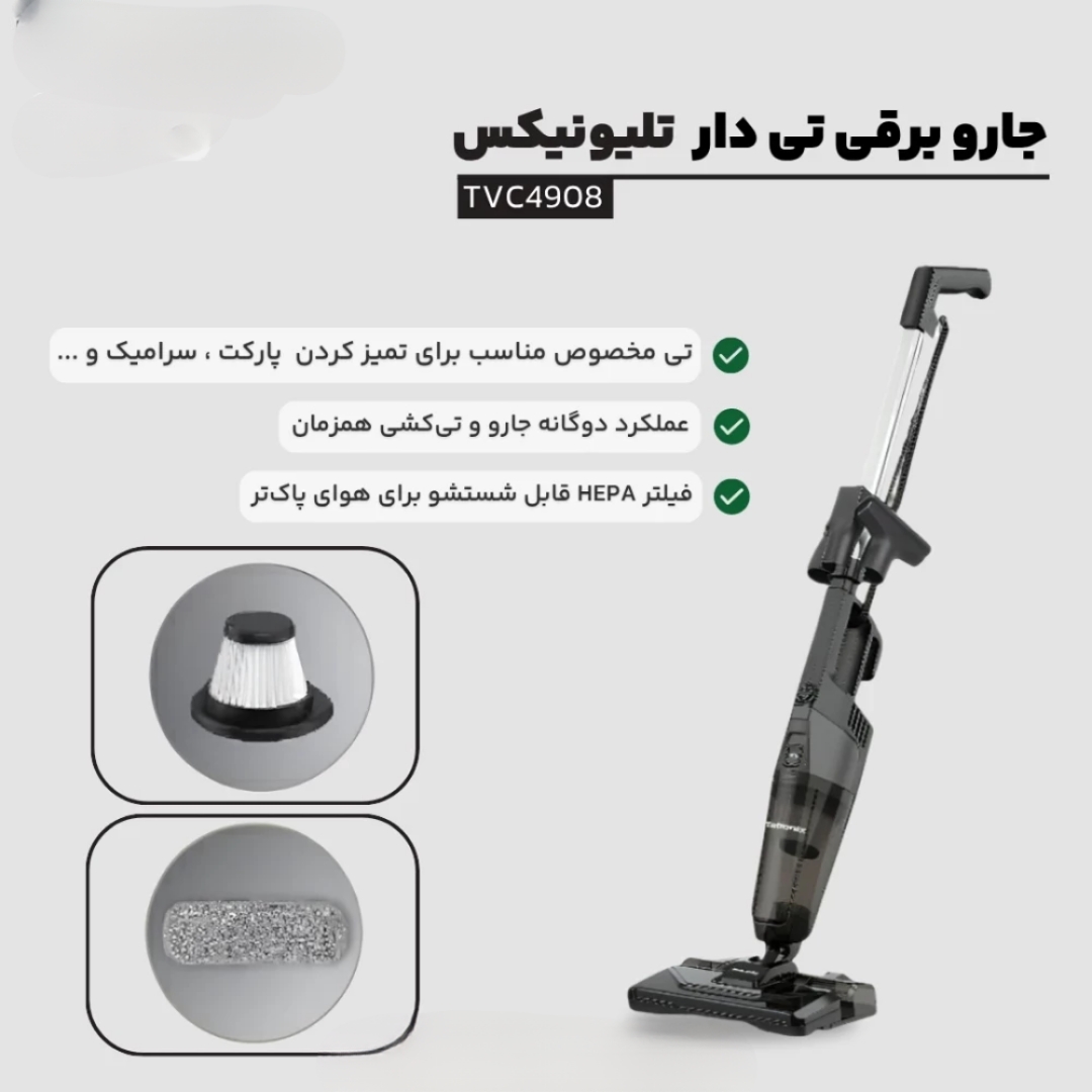 مدل: TVC4908نوع : جارو برقی ایستاده و تی دارجنس بدنه : پلاستیک مقاومطول سیم : 7 مترظرفیت مخزن: 0.6 لیترمیزان صدا : 79 دسی بلقدرت موتور: 600 وات (موتور مسی)نوع فیلتر: HEPA قابل شستشواقلام همراه:نازل شکافگیر، مخزن آب، تی گردگیر (2 عدد)، برس مبل، برس ترکیبی، رابط، نگهدارندهسایر مشخصات:قابلیت تمیز کردن سطوح مرطوب، موتور مسی، برس کف